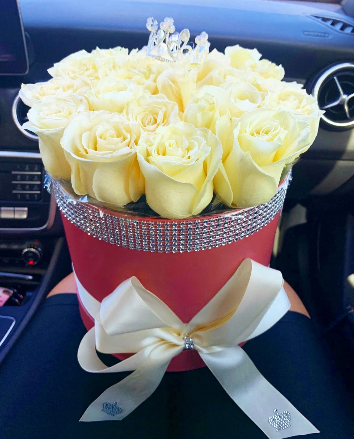 The roses are nestled into our traditional Round Box. This Roses arrangement coming with 20 to 25 white Roses.