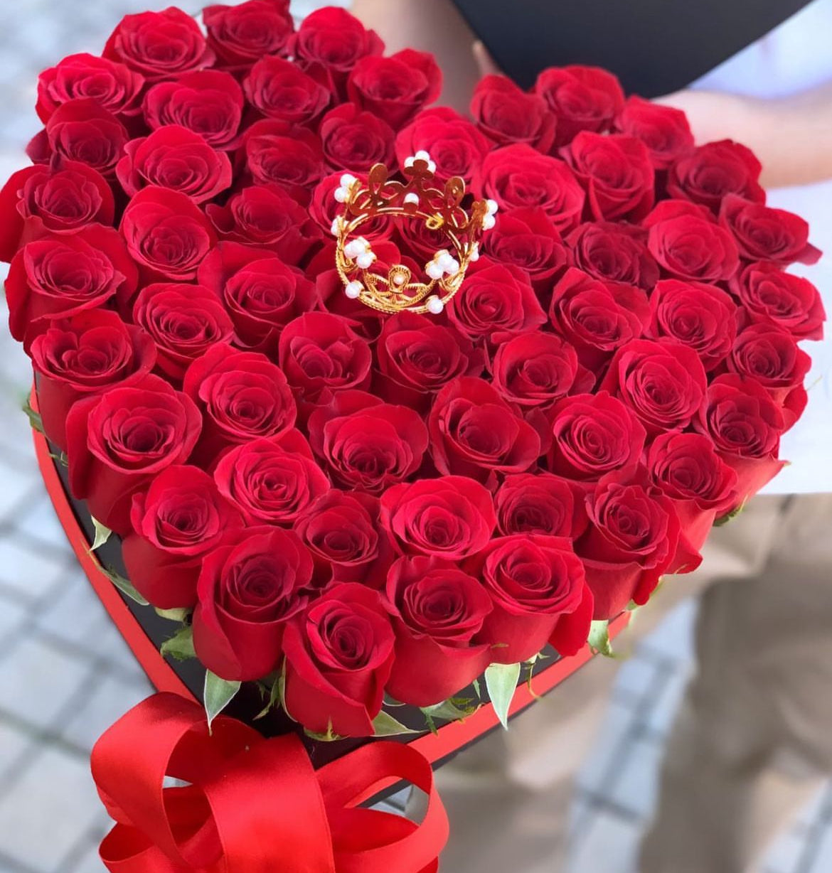 Description: The roses are nestled into our traditional "Love" Box which is shape like a heart. Up to to 53-55 Fresh Roses.