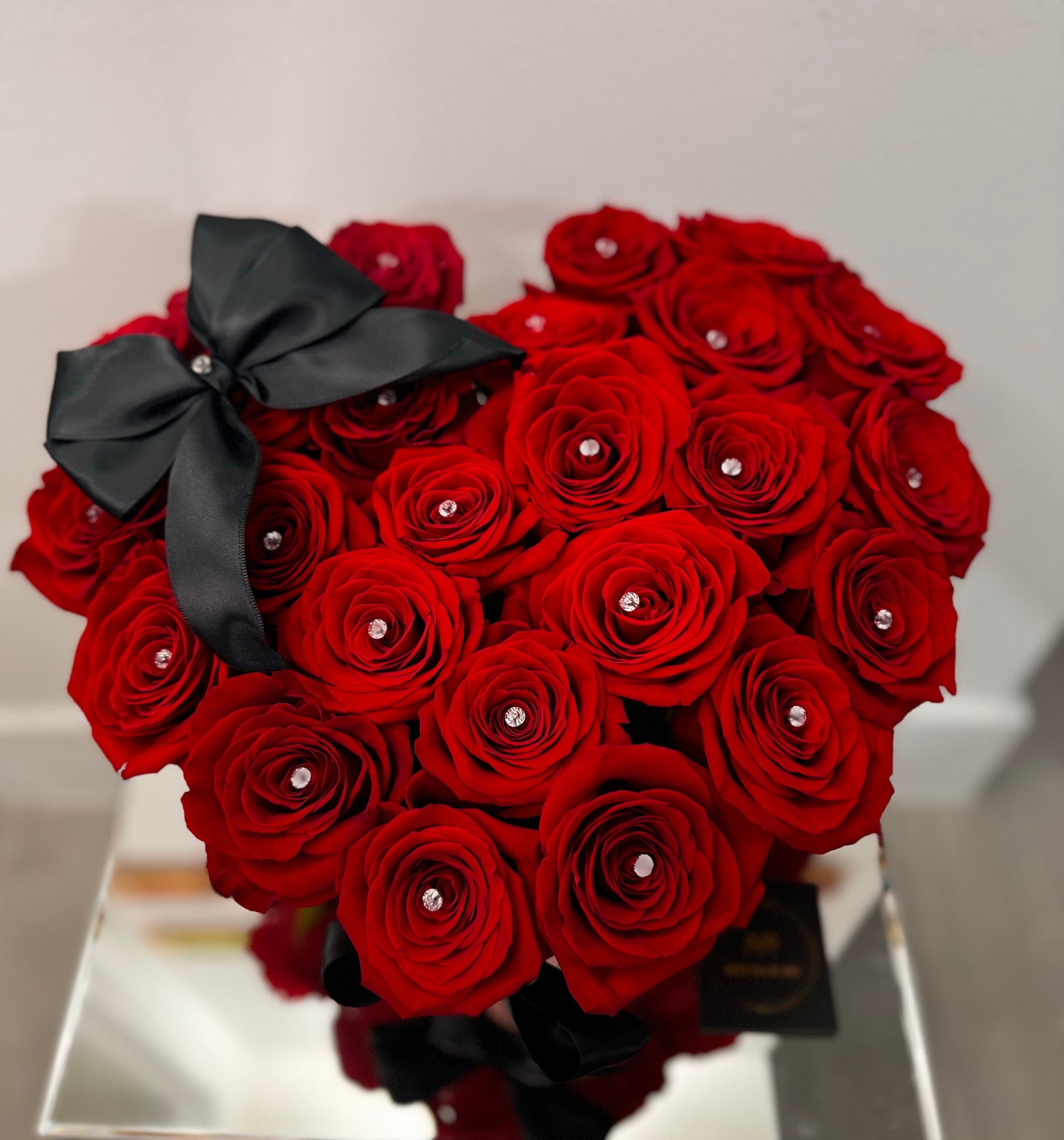 Description: The roses are nestled into our traditional "Love" Box which is shape like a heart. Up to to 23-26 Fresh Roses.