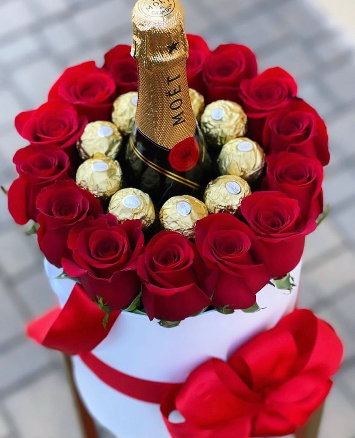 This arrangement Includes Moët & Chandon - Brut Champagne Impérial (750 ml), Ferrero Rochet chocolate, and fresh Roses. You have the option to choose the color of roses as you like. Up to to 18-20 Premium Fresh Roses. Boxes color may vary!