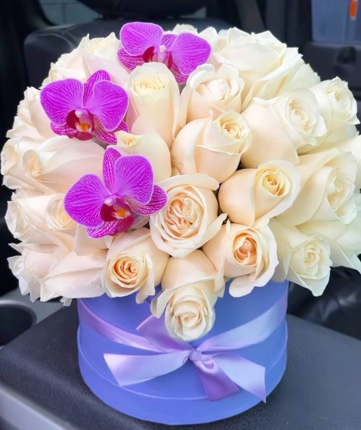 The roses are nestled into our traditional Round Box. Up to to 35 Fresh Roses