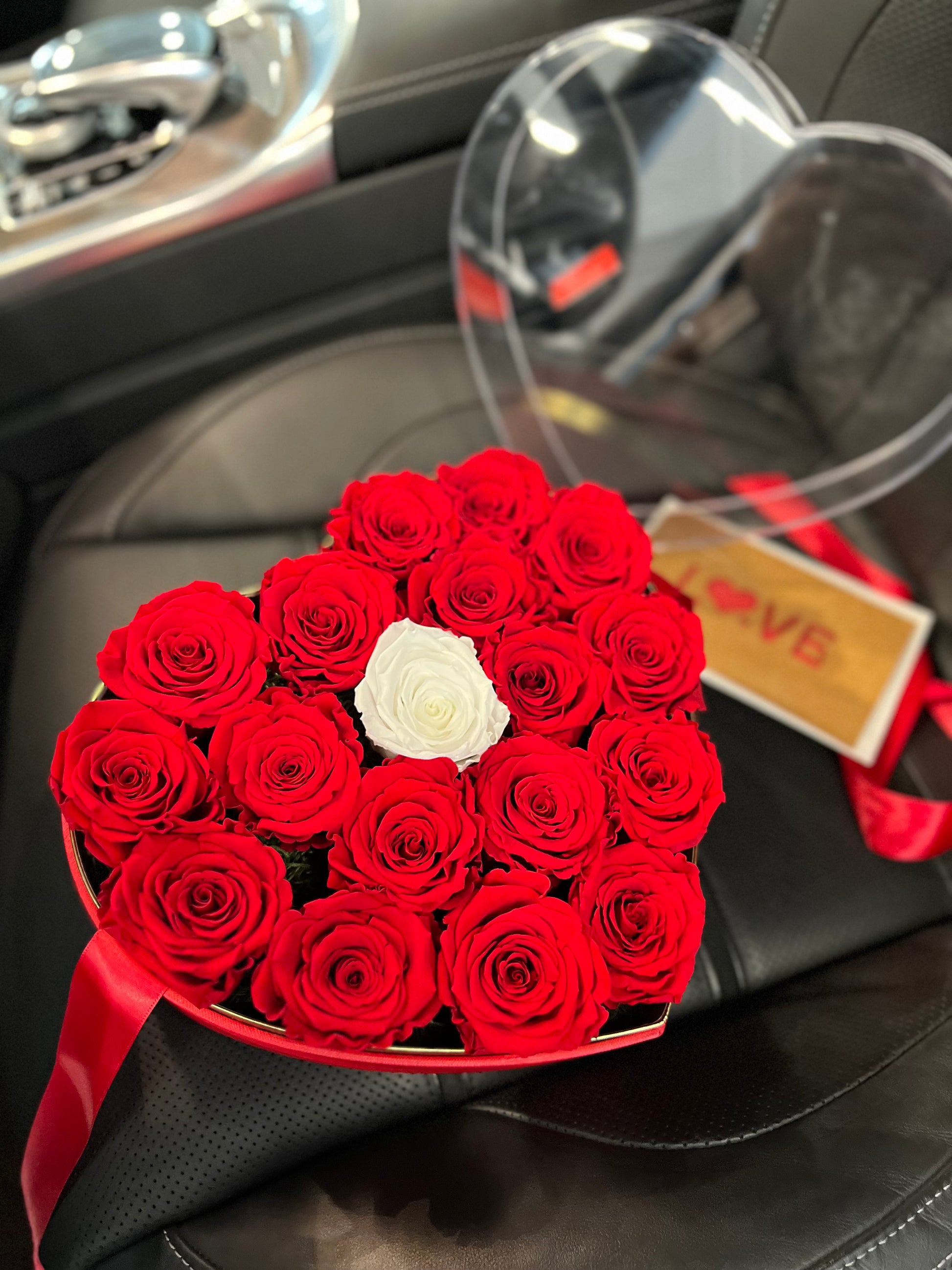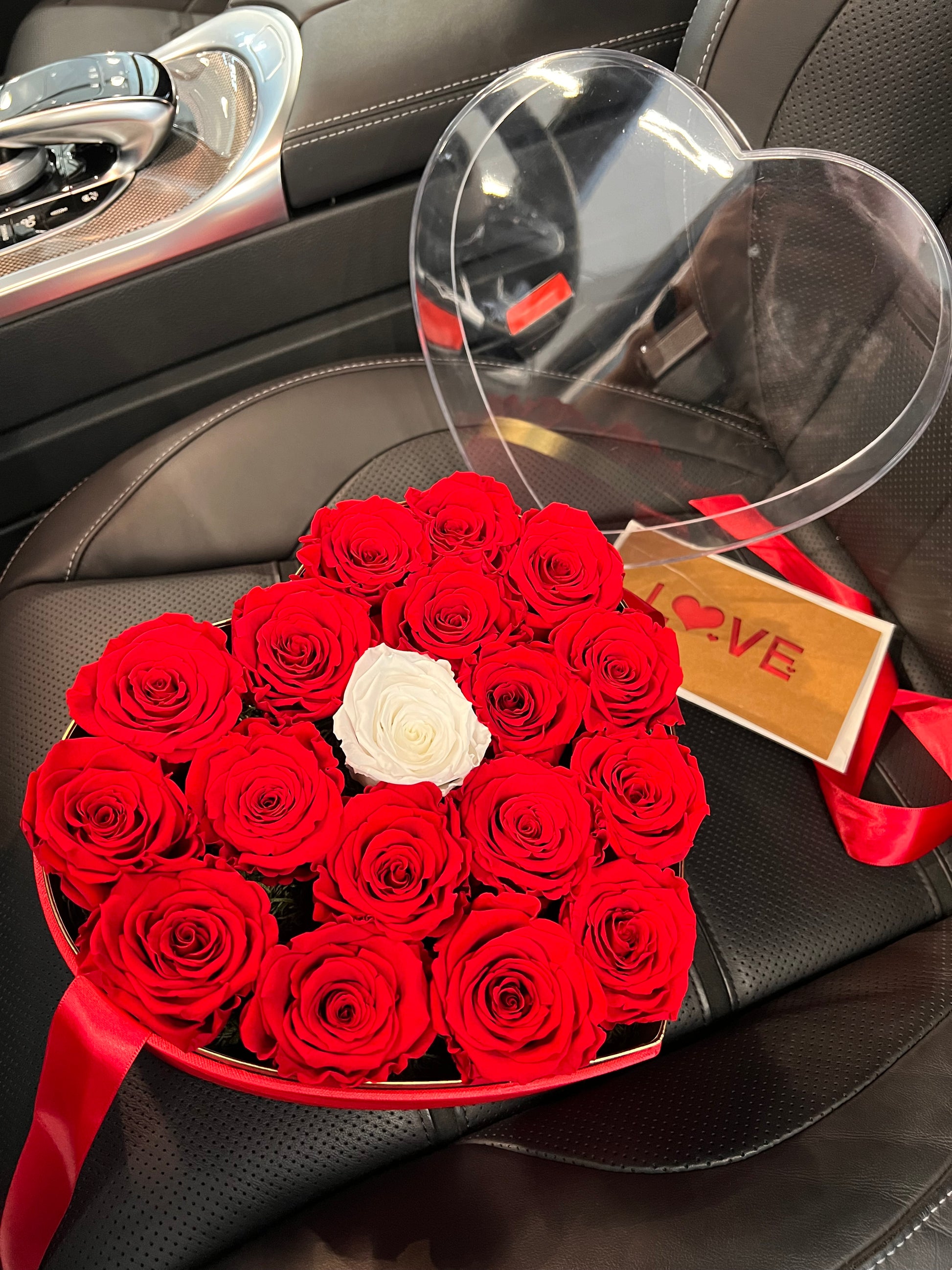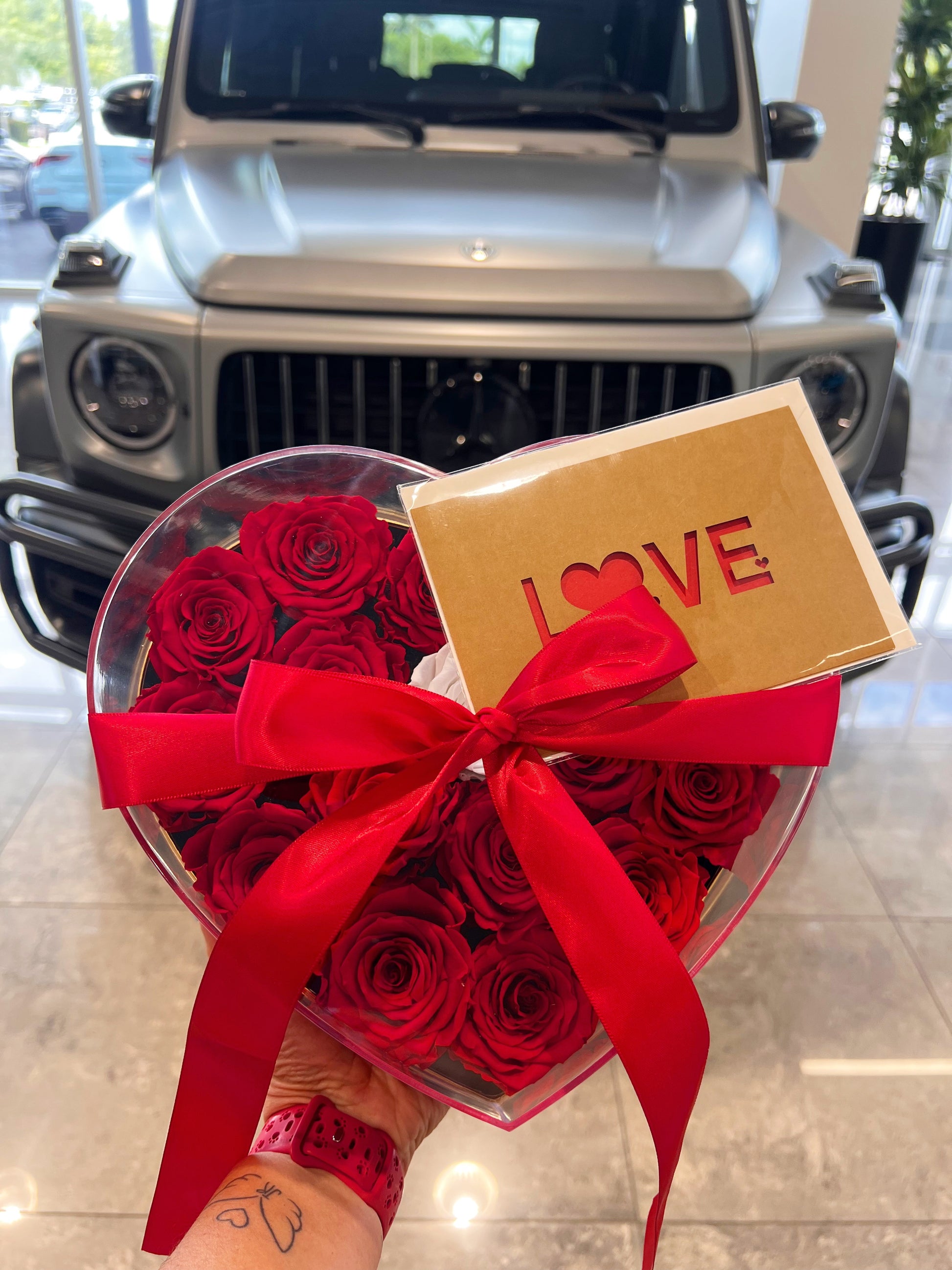 DESCRIPTION: The roses are nestled into our traditional, Acrylic “love” box, which is shape like a heart. Up to to 16-18 Roses.
