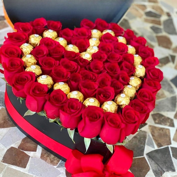 Description: The roses are nestled into our traditional "Love" Box which is shape like a heart. Coming with Chocolates Ferrero. Up to to 40 Fresh Roses.