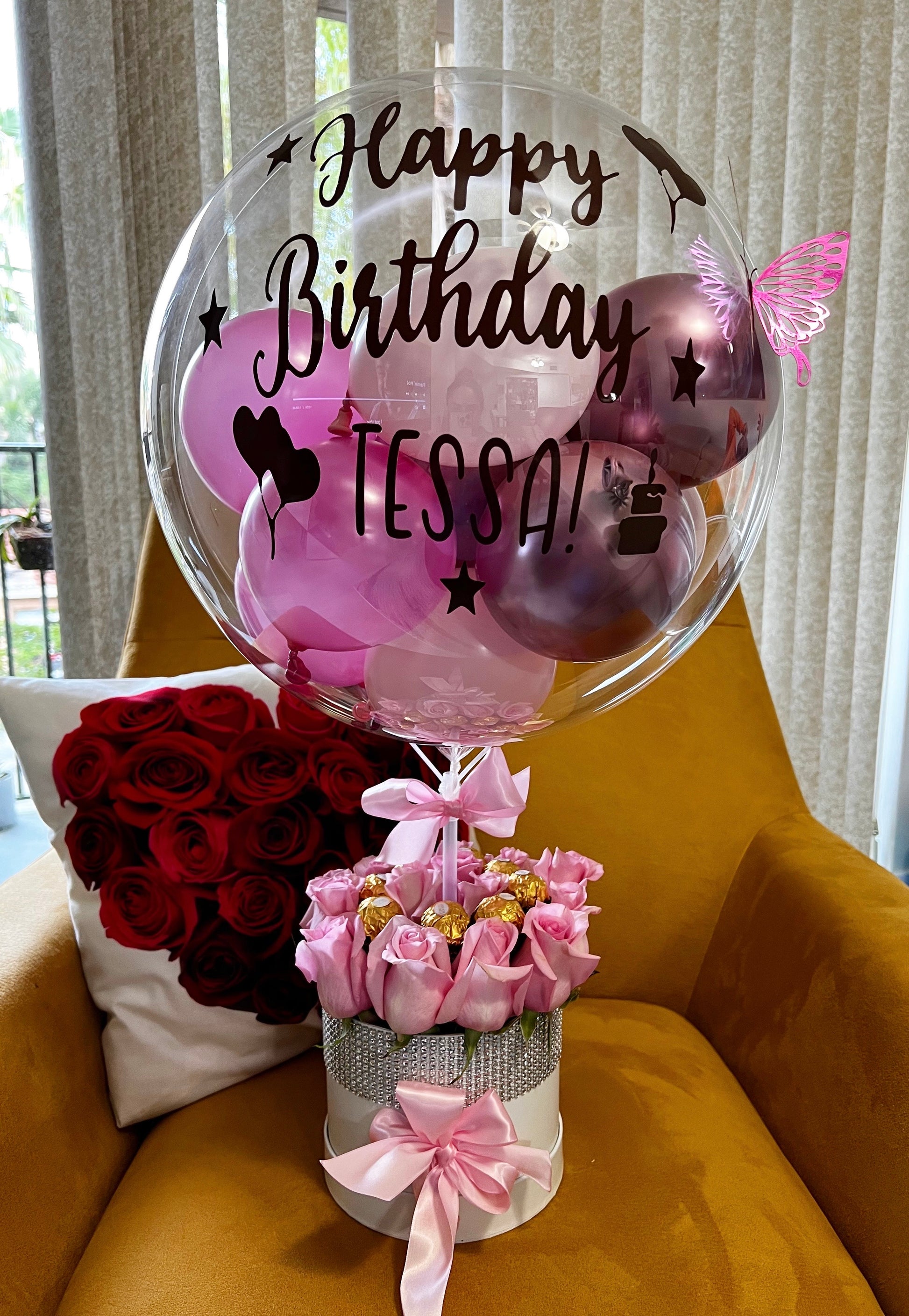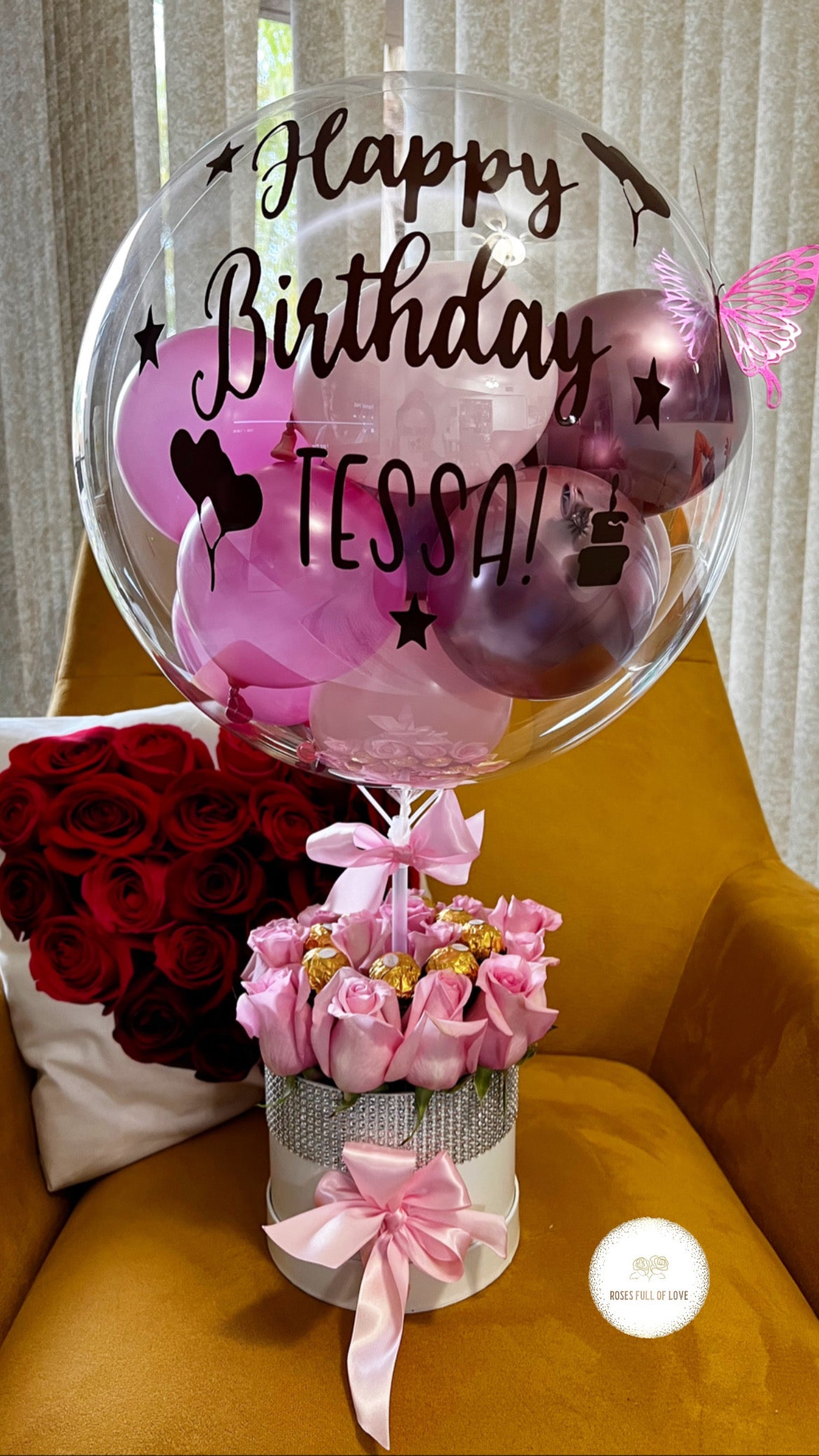 You will have a Personalized Bubble Balloon. The roses are nestled into our traditional Square Box. You have the option to choose the color of roses as you like. Up to to 12-15 Fresh Roses. Boxes color may vary!