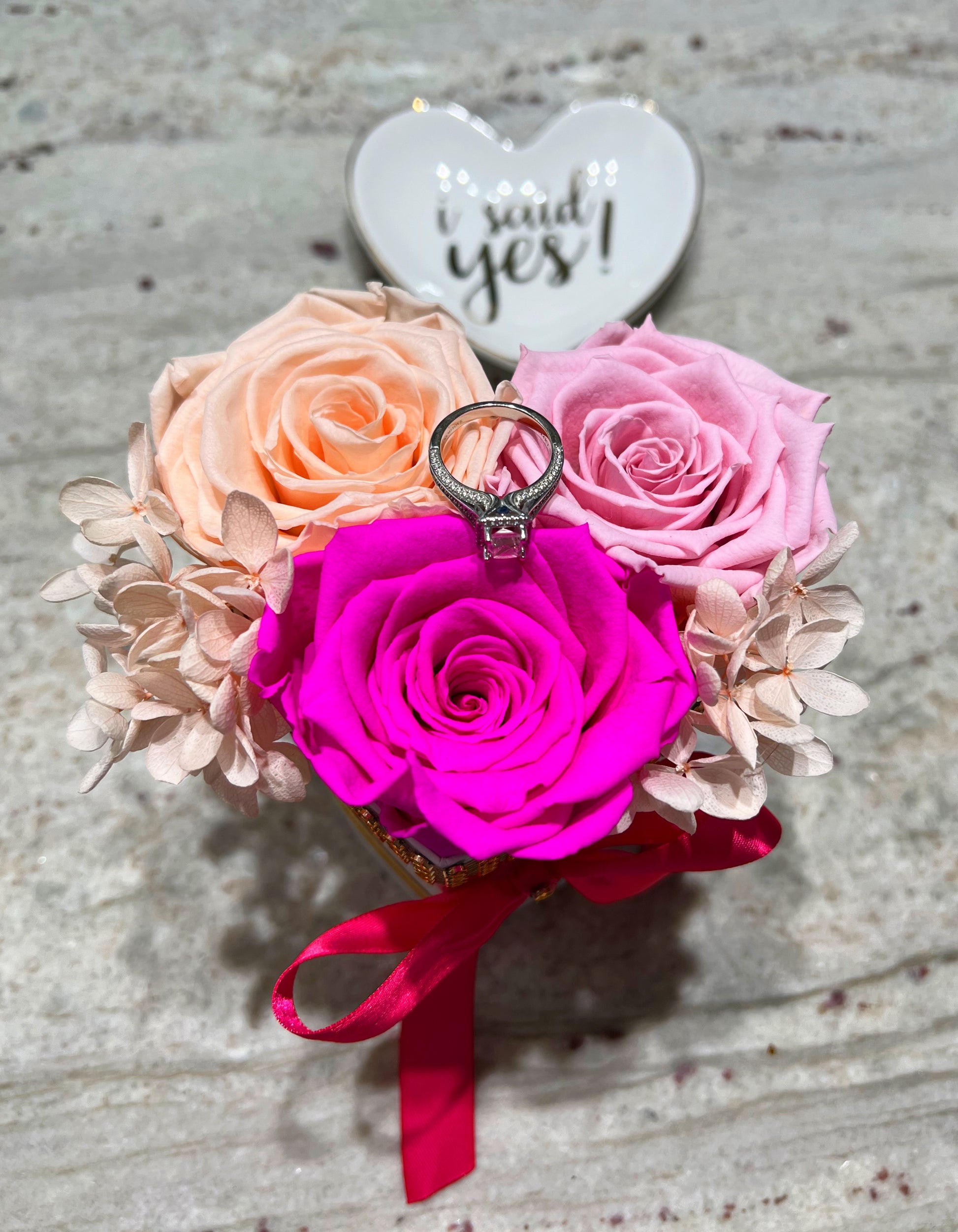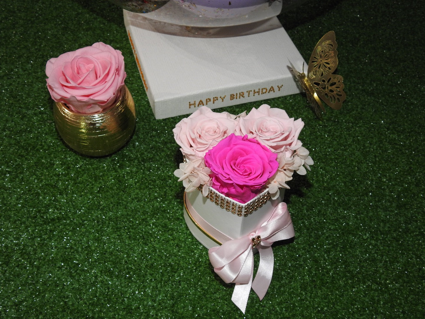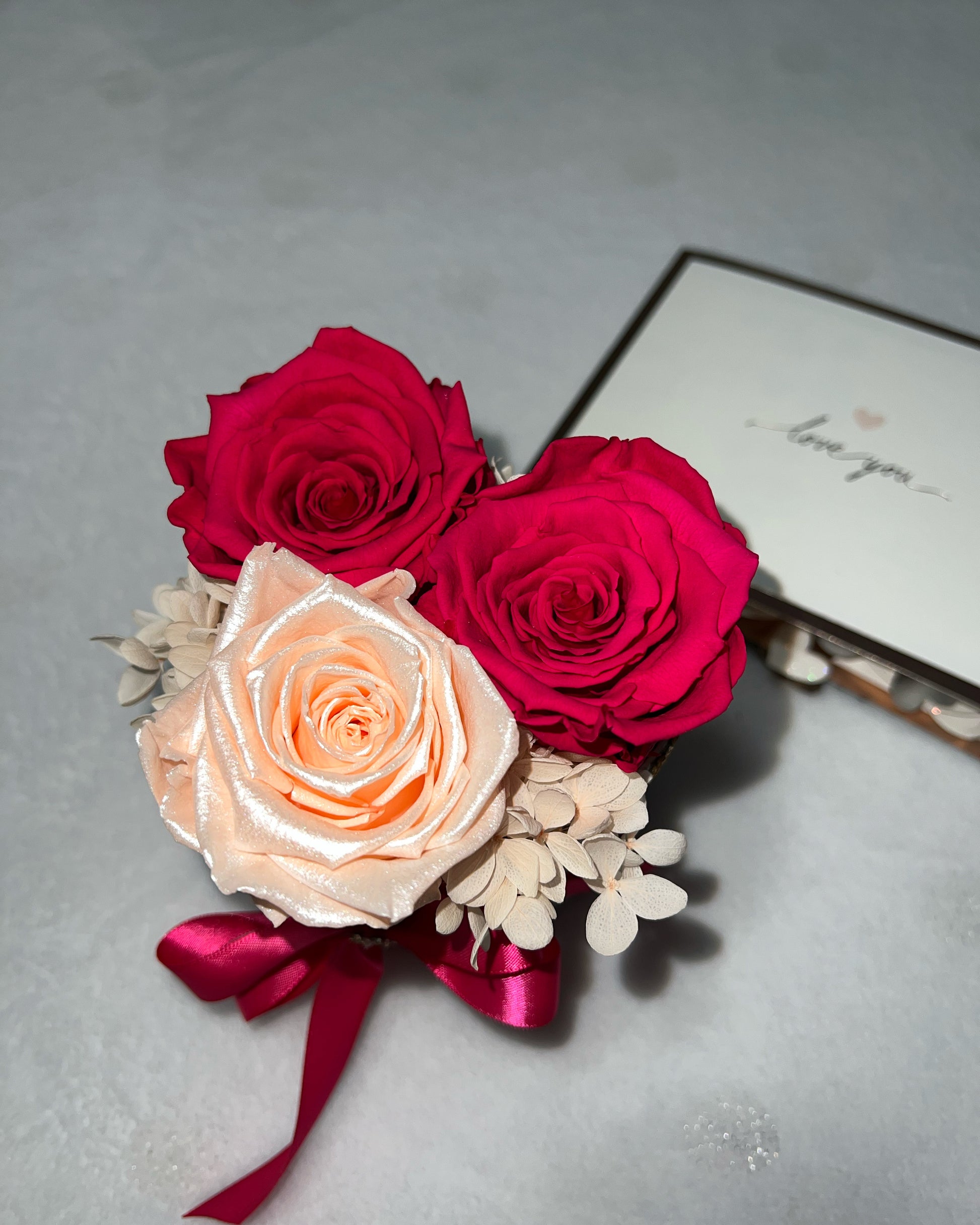 DESCRIPTION: The roses are nestled into our traditional, “love” box, which is shape like a heart. Up to three preserved roses. You can mixed colors of roses if you like.
